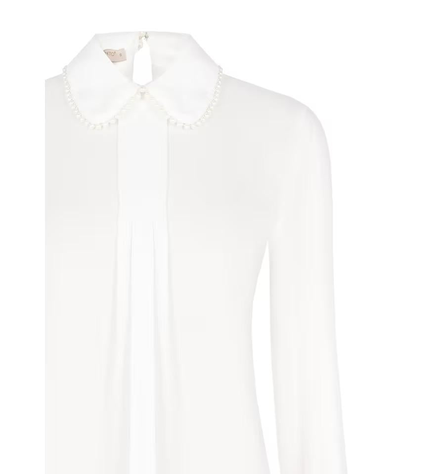 Rinascimento propone un top fluido dal fit dritto, che accarezza la silhouette senza stringere. Tessuto morbido e leggermente satinato per comfort tutto il giorno. Colletto arrotondato rifinito da micro perle e piega centrale che slancia. Perfetto per ufficio e occasioni speciali, facile da abbinare a tailleur o denim.