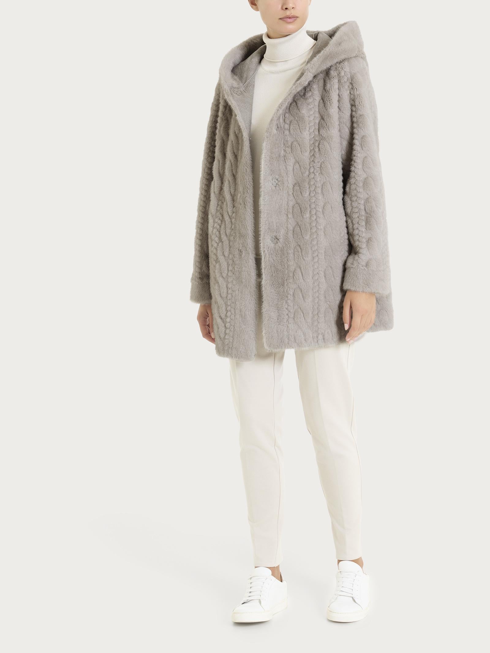 Il cappuccio protegge nelle giornate più fredde, mentre la chiusura frontale invisibile mantiene una linea pulita ed elegante. Il taglio comodo e contemporaneo veste alla perfezione senza costringere, accompagnando con classe ogni movimento.