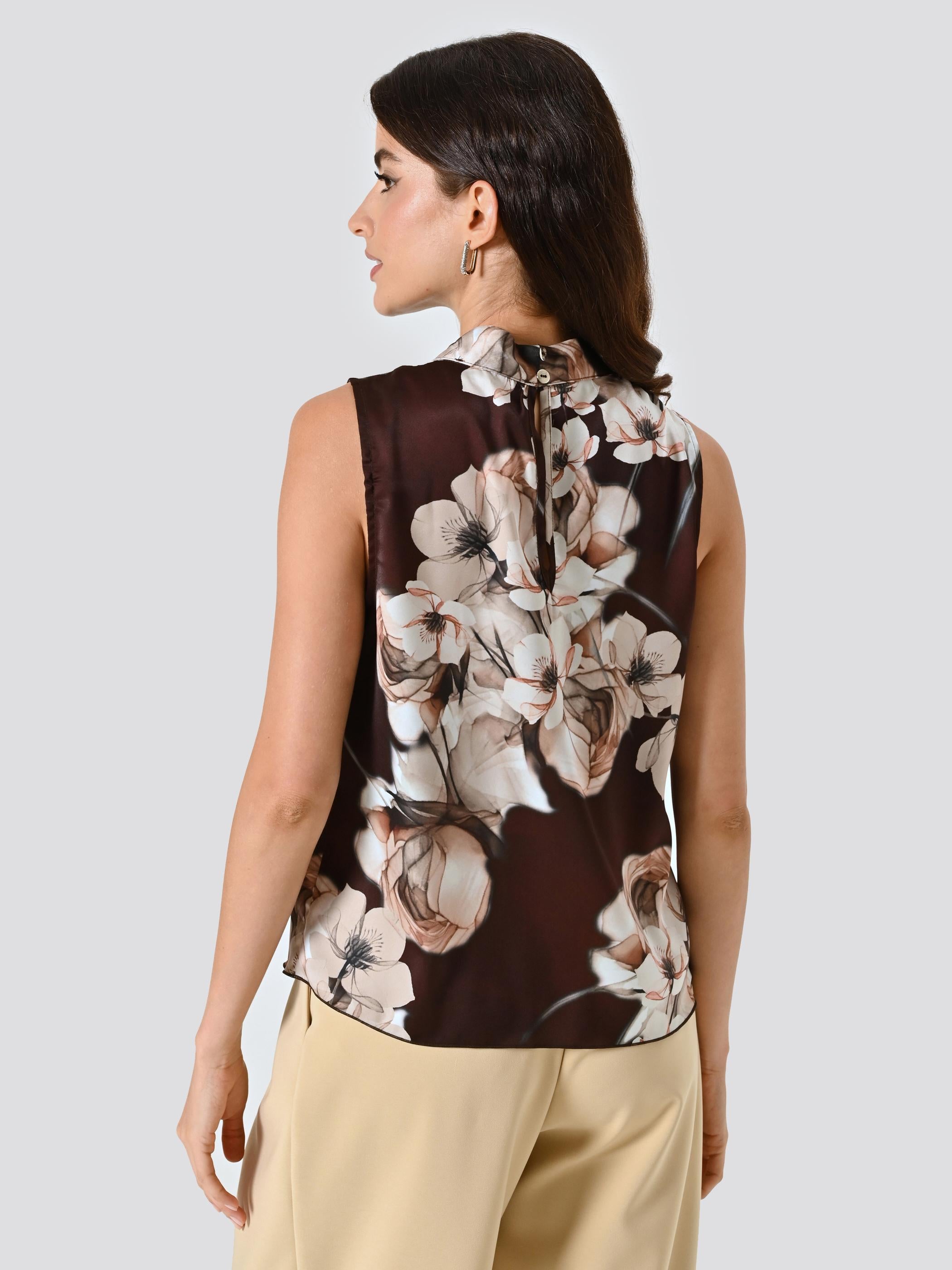 La blusa con stampa floreale unisce eleganza e sostenibilità grazie al raso parzialmente riciclato. Smanicata e arricchita da un dettaglio gioiello, valorizza la figura con un raffinato drappeggio sul corpino. Versatile e sofisticato, si abbina con facilità a jeans, gonne o pantaloni, ideale per ogni occasione, dal lavoro agli eventi speciali.