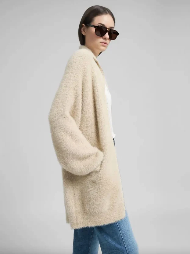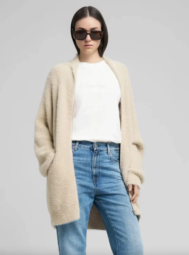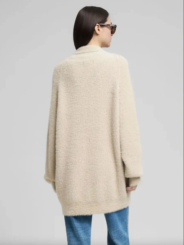 Cardigan lungo realizzato in filato tecnico effetto hairy, per una sensazione di comfort e morbidezza sulla pelle. Il modello presenta un particolare collo alto che si apre in uno scollo a V da cui parte una chiusura con zip fino a fondo capo. Completano il design le tasche laterali a filettone, di cui una rifinita dal dettaglio R.