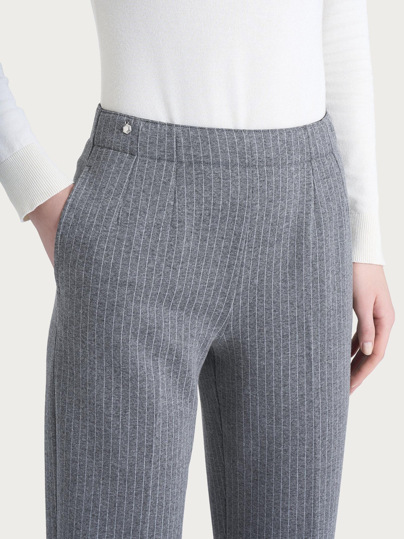 Questo modello gessato con sottili righe verticali è costruito con vita elasticizzata e senza zip, ma con pratiche tasche laterali.