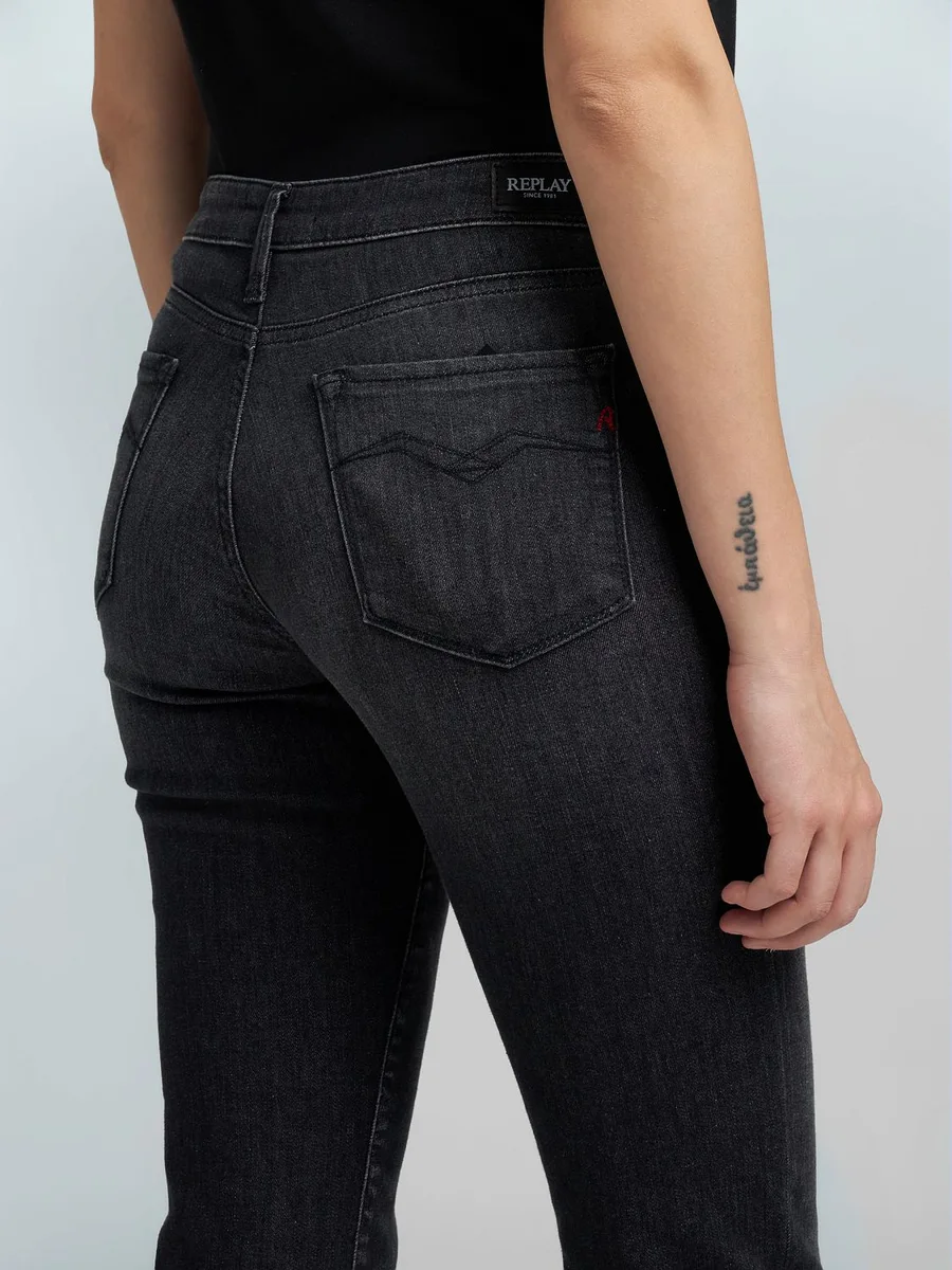 Jeans straight fit con vita alta e gamba dritta dall'anca al fondo per una vestibilità comoda. Il capo cinque tasche è realizzato in power stretch denim nero di cotone 10 oz a trama bianca con lavaggio enzimatico in tono scuro, e presenta baffi e carteggio eseguiti a mano che creano contrasti sulle zone d'usura. L'iconica cucitura ala di gabbiano caratterizza le tasche posteriori, una delle quali è rifinita dal ricamo R. Chiusura con bottone e zip.