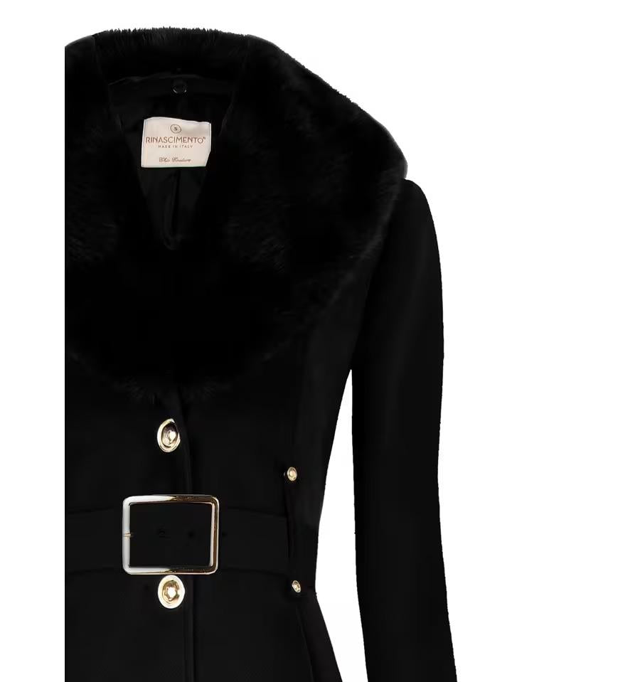 Cappotto dal fit sfiancato che valorizza la silhouette. Morbido velour dall'effetto vellutato, caldo e confortevole. Collo in eco-pelliccia removibile e cintura in similpelle con fibbia metallica per definire il punto vita. Bottoni gioiello frontali. Perfetto dall'ufficio agli eventi serali, anche su abiti.