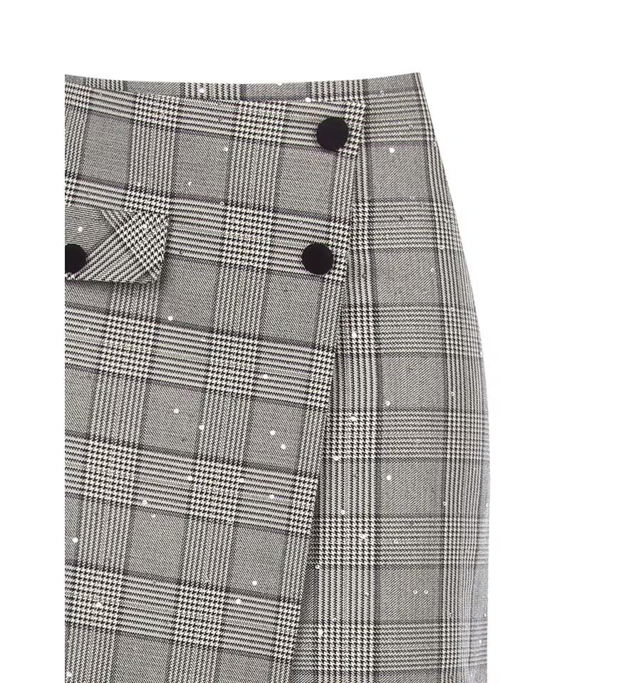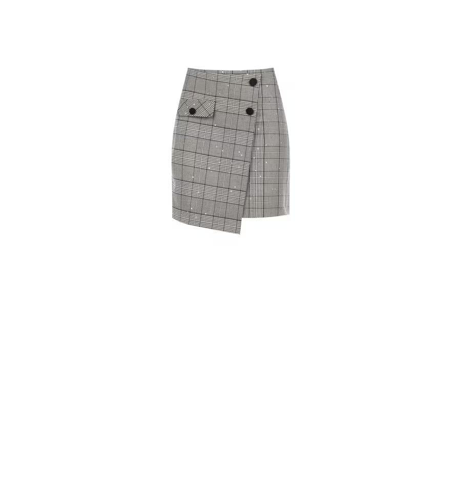 Minigonna dritta che valorizza il punto vita. Tessuto a quadri compatto con micro paillettes per una texture luminosa ma confortevole. Patta con bottoni e chiusura doppiopetto asimmetrica: un dettaglio che slancia la silhouette. Perfetta per l'ufficio con un blazer, ideale anche per cocktail e feste.