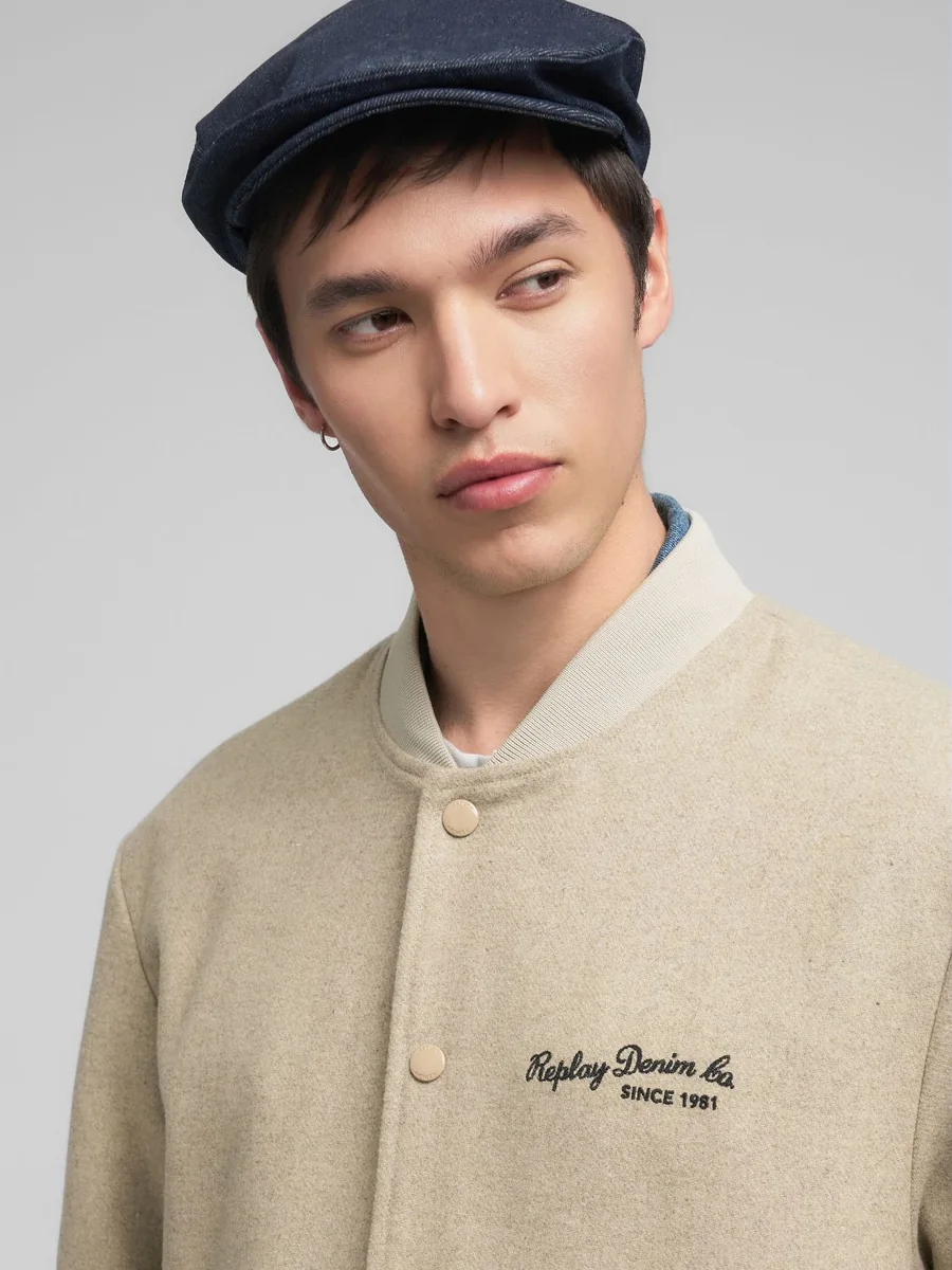 Bomber d'ispirazione varsity con vestibilità regolare realizzato in misto lana melton foderato. Il modello si caratterizza per il lettering personalizzato ricamato a contrasto sul petto, la lavorazione a costine su colletto, polsini e fondo capo e i profili rigati che rifiniscono i polsini e le due tasche laterali. Completa il capo la chiusura frontale con bottoni automatici.