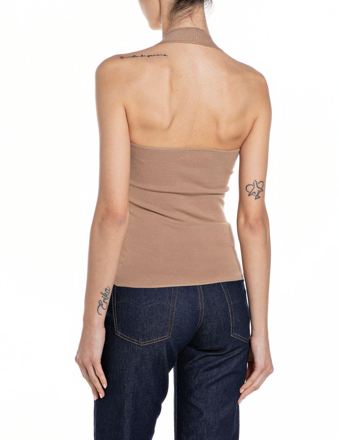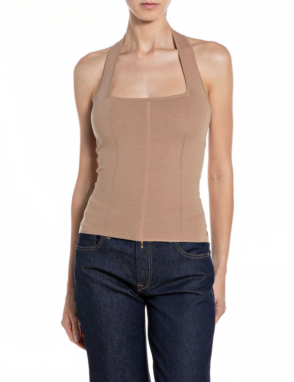 Top aderente in maglia di misto viscosa. Questo capo presenta uno scollo all'americana con taglio quadrato e spalline larghe che lasciano scoperte spalle e parte superiore della schiena. Le due linee verticali traforate sul davanti e la R con rivetti sul lato completano il design.