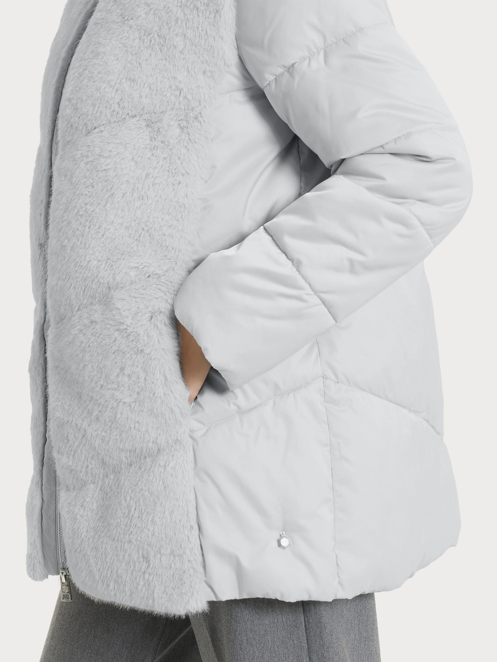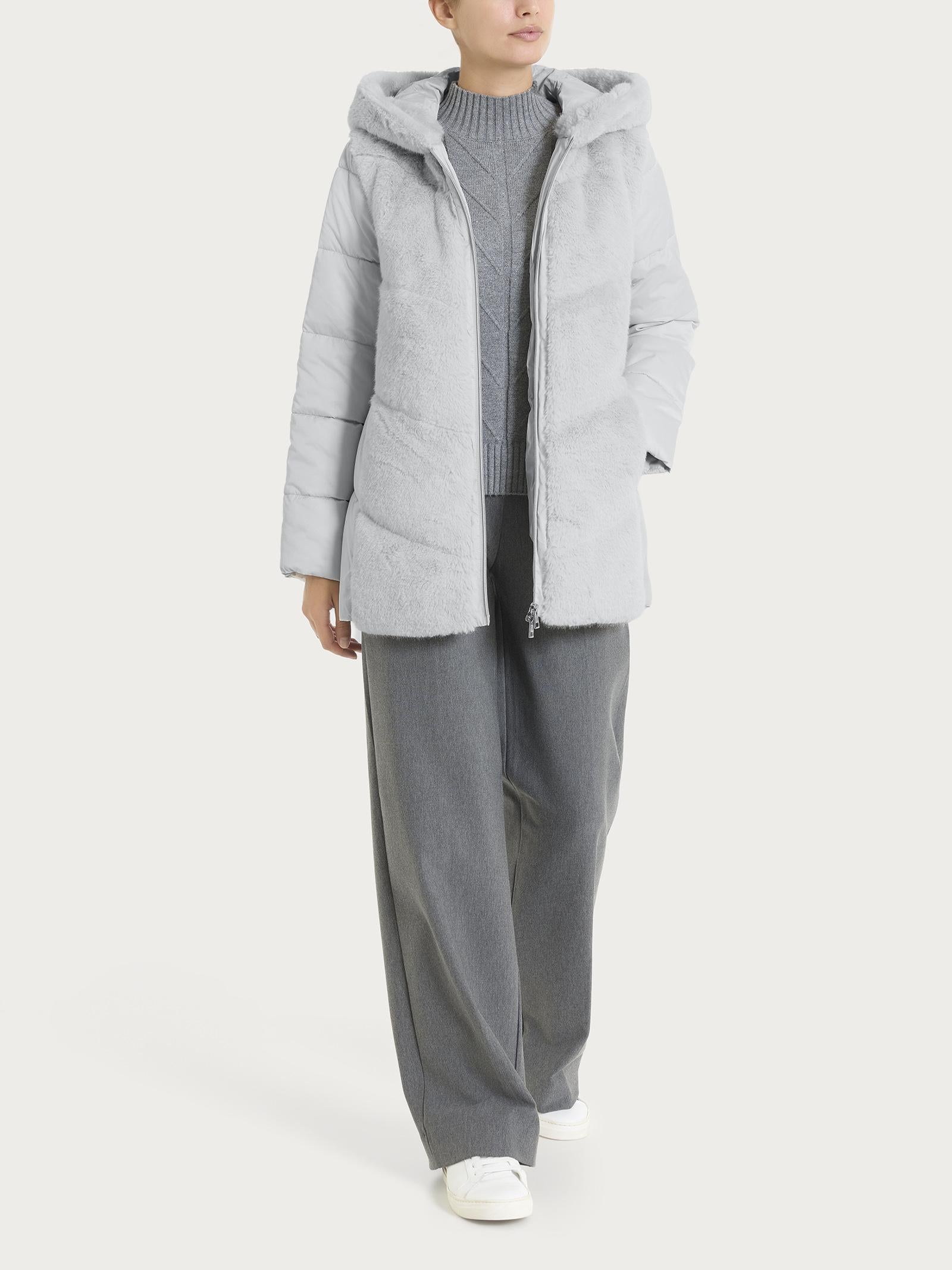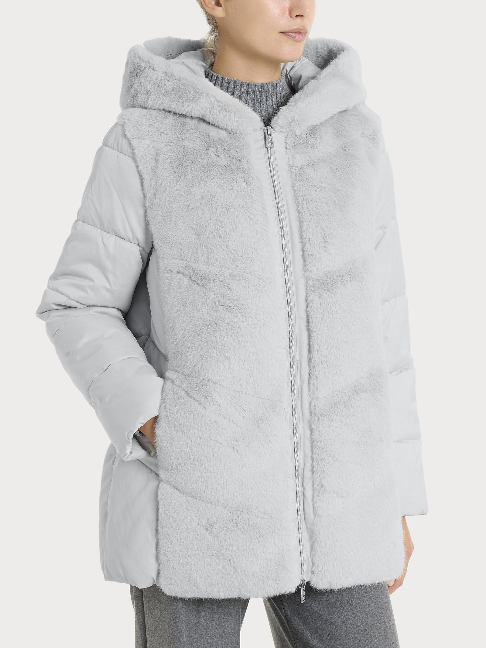 Realizzato in down jacket e vegan fur, nasce dalla fusione del piumino con la vegan fur, alternativa etica e glamour alla pelliccia tradizionale: soffice, calda e 100% cruelty-free, per vestire con stile e consapevolezza.