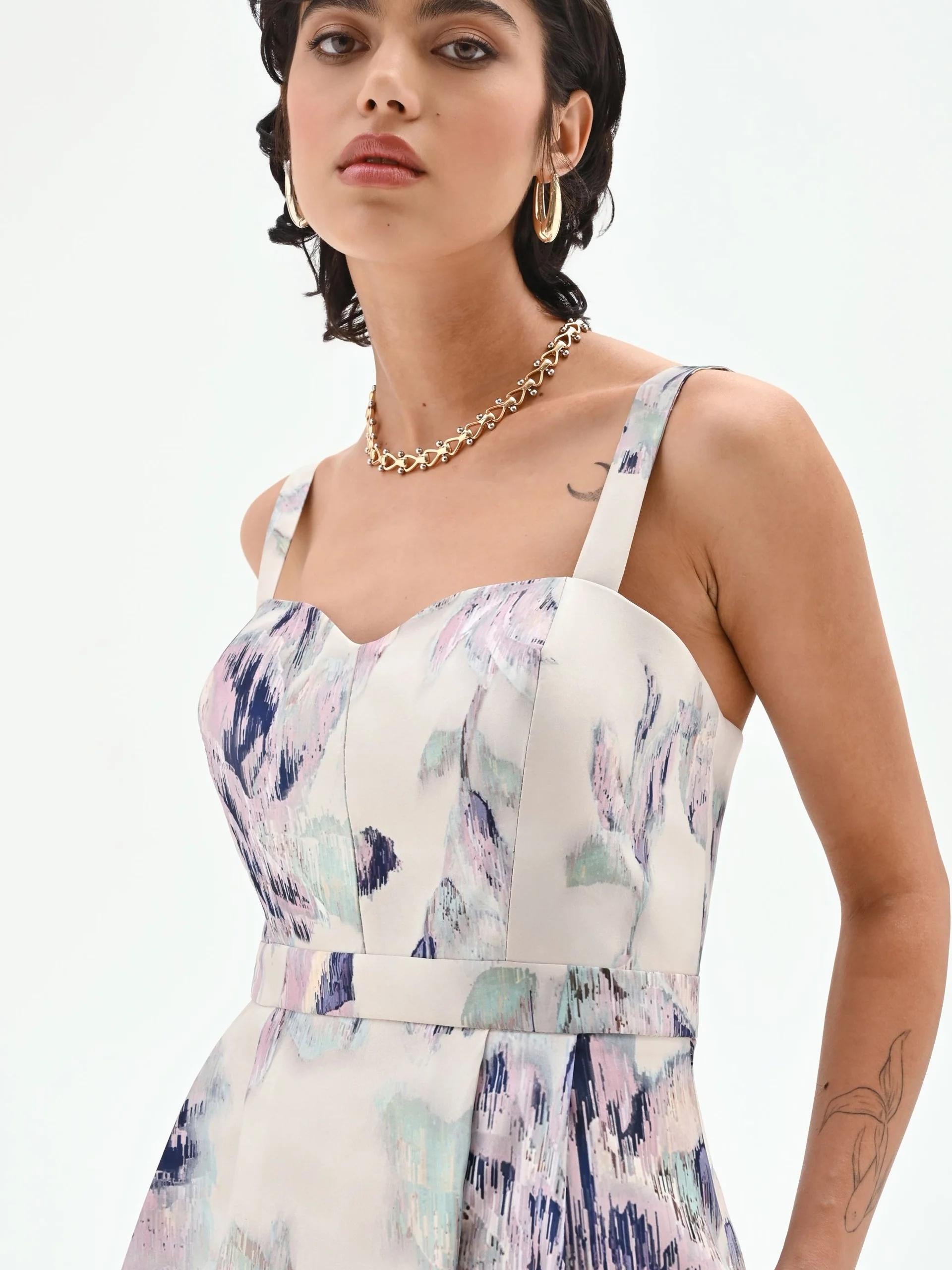 Perfetto per cerimonie primaverili, garden party o eventi speciali alla luce del sole, questo capo catalizza l'attenzione se abbinato ad accessori e scarpe della collezione, preferibilmente in tonalità che richiamino le nuances della stampa.