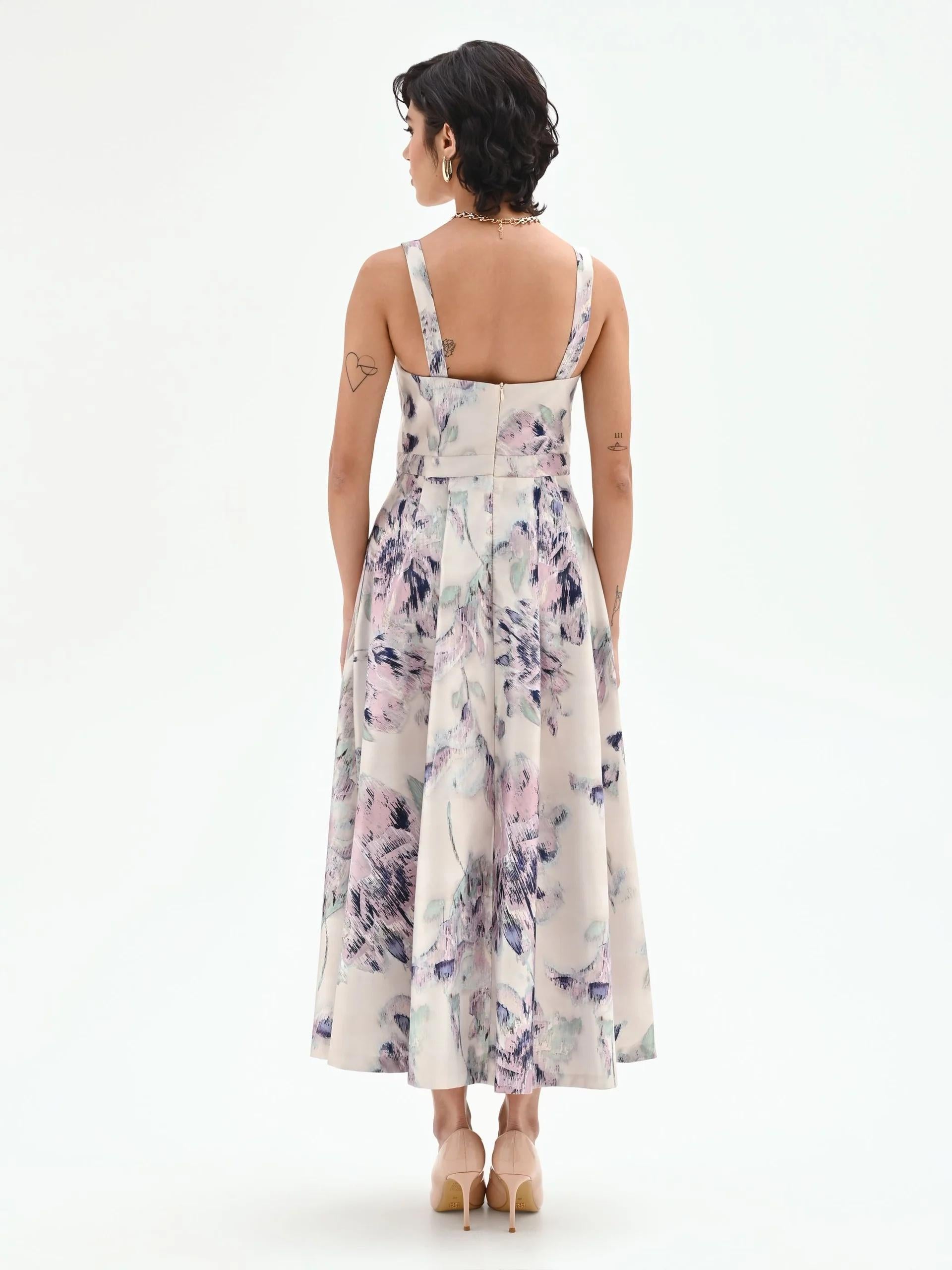 La silhouette a clessidra è costruita per valorizzare la figura: il corpetto aderente e strutturato presenta un seducente scollo a cuore e spalline larghe, bilanciando il volume della gonna. Una fascia nello stesso tessuto sottolinea il punto vita, da cui si apre la gonna ampia e svasata che scende morbida fino a metà polpaccio, donando movimento e leggerezza all'insieme. La chiusura con zip garantisce una vestibilità precisa e confortevole.