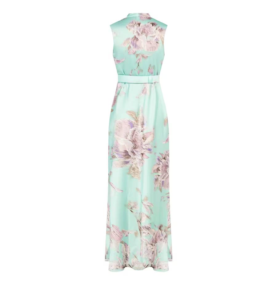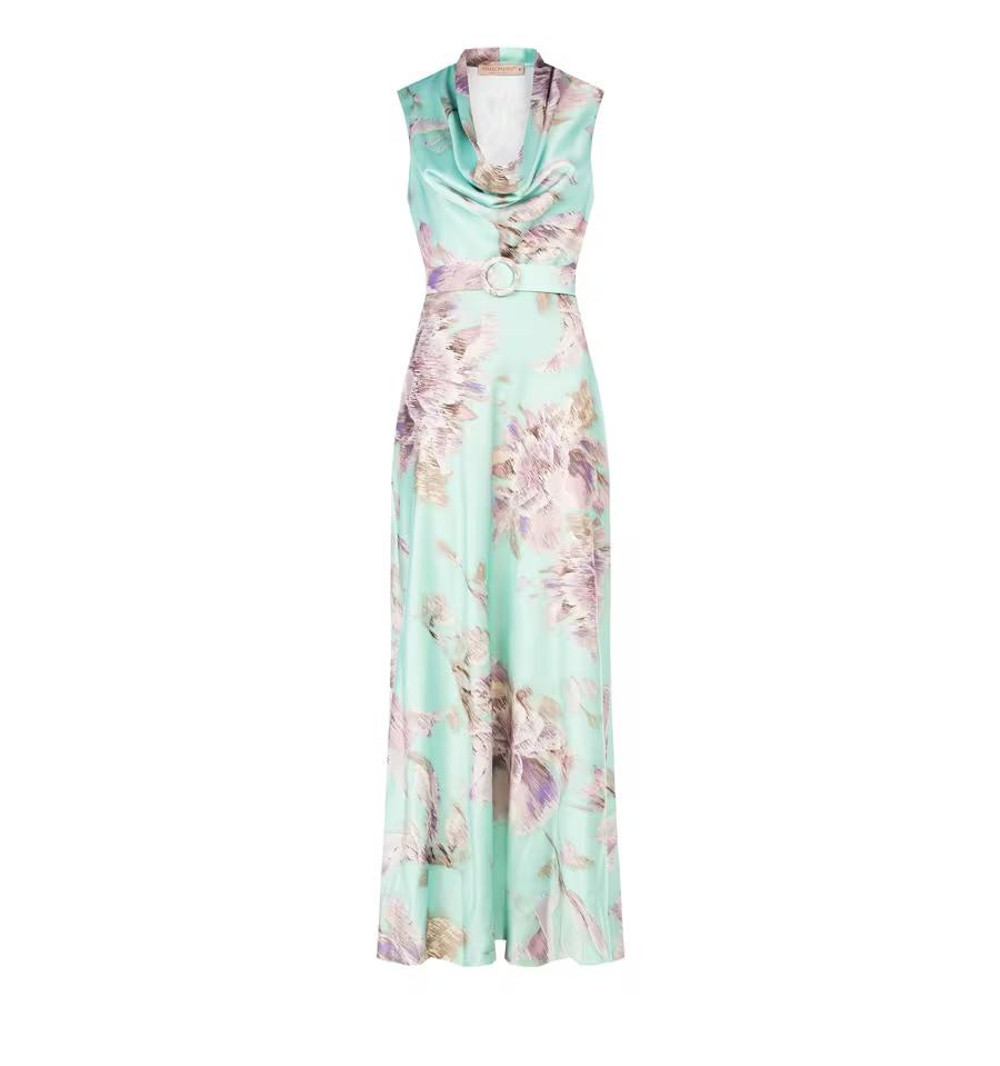 Abito lungo Rinascimento in tessuto fluido effetto raso, dalla linea fluida e con punto vita definito. La scollatura a cascata esalta il décolleté, mentre la cintura con fibbia rotonda sottolinea la silhouette. Perfetto per cerimonie, feste e occasioni speciali.