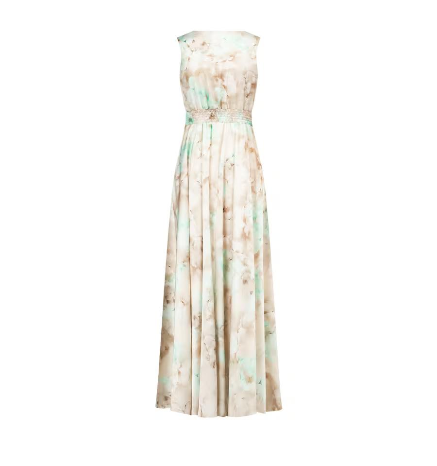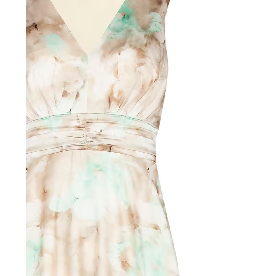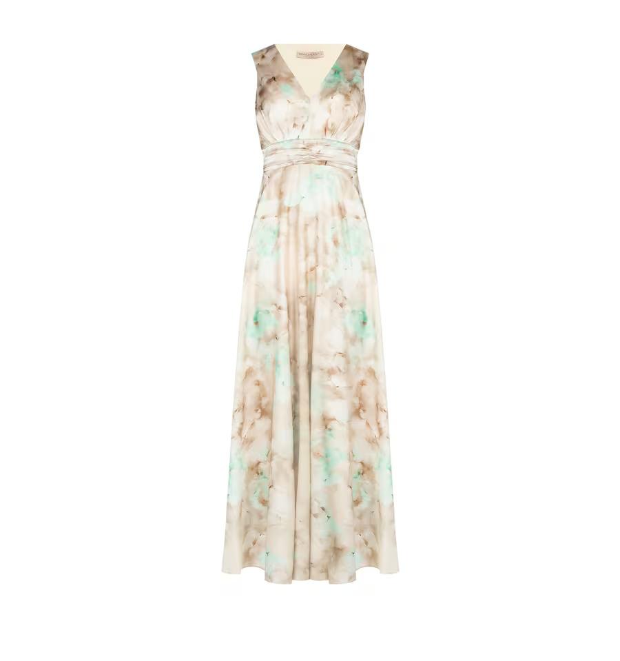 Lungo e fluido, avvolge la silhouette senza costringerla grazie al tessuto leggero e morbido. Lo scollo a V incrociato e la cintura arricciata sottolineano il punto vita, mentre la stampa sfumata dona movimento. Perfetto per cerimonie, cocktail e occasioni speciali.