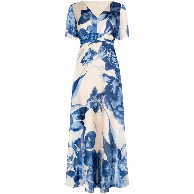 Vestito lungo fluido in tessuto leggero a stampa floreale, morbido sui fianchi e valorizzato dal punto vita arricciato. Lo scollo a V slancia la silhouette, mentre il retro con fascia elastica garantisce comfort. Perfetto per cerimonie, eventi estivi e party serali.