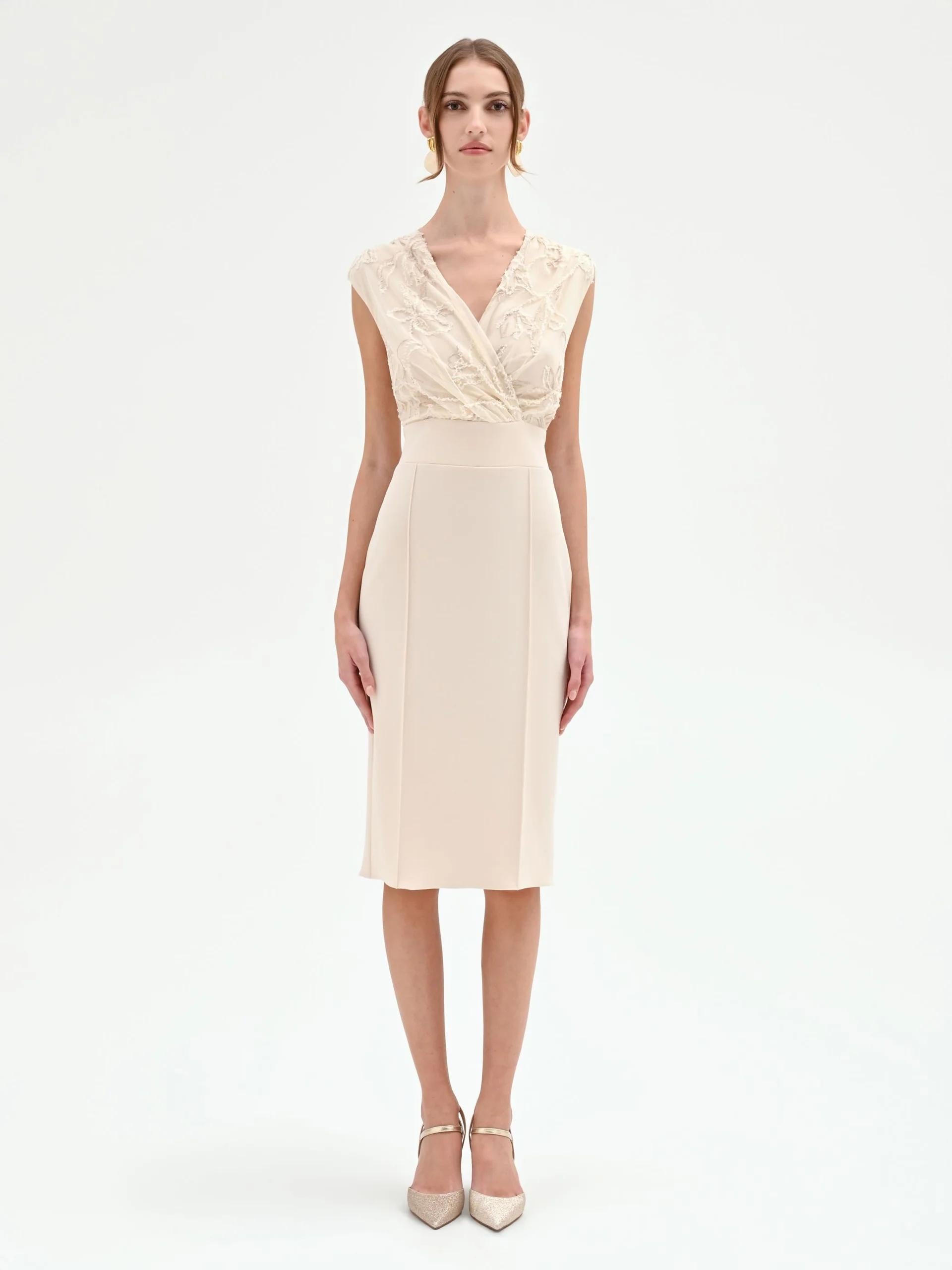 La parte superiore è caratterizzata da un delicato ricamo floreale tridimensionale tono su tono, che impreziosisce lo scollo a V incrociato e le maniche a cappuccio che coprono le spalle con grazia. La gonna a matita, introdotta da un'alta fascia che segna il punto vita, segue la silhouette con una linea pulita e aderente fino al ginocchio. Chiusura con zip e bottoncino.