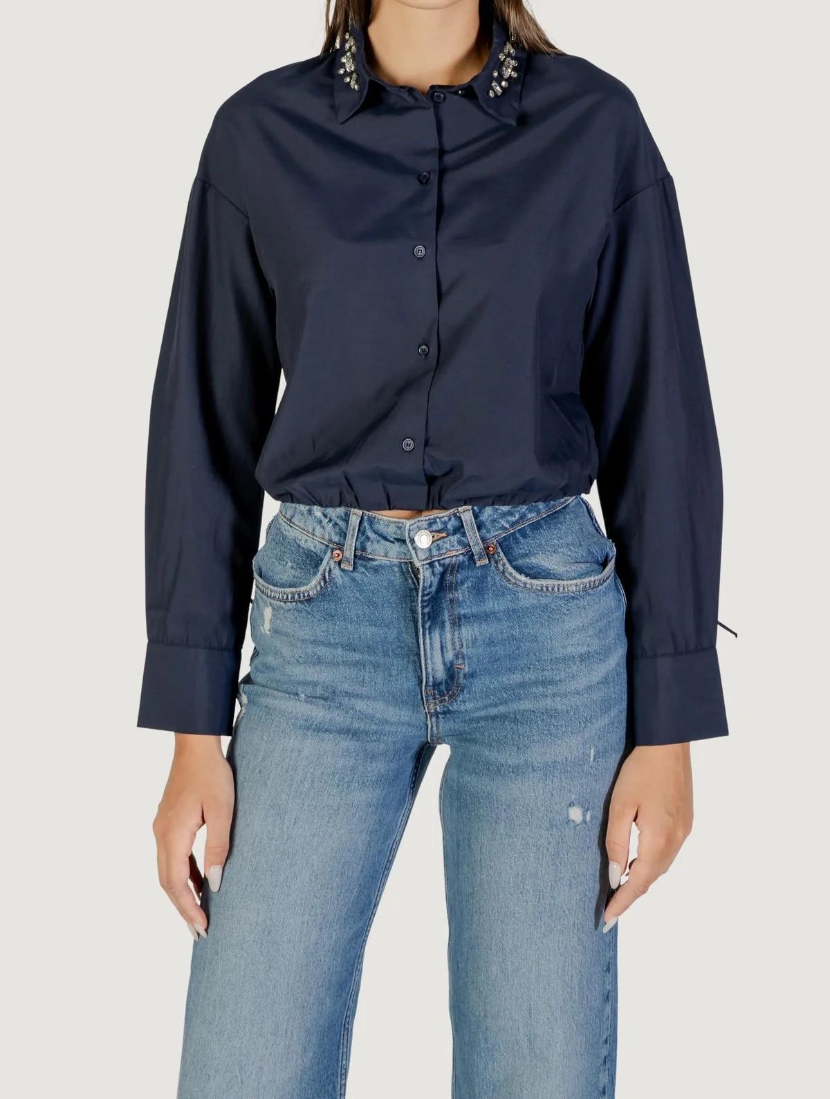 Realizzata con una composizione di 52% poliestere e 48% cotone, offre una vestibilità confortevole e una piacevole sensazione sulla pelle. Il taglio cropped valorizza la silhouette, mentre le maniche balloon donano un tocco di originalità e femminilità. Il colletto classico è impreziosito da eleganti applicazioni gioiello, perfette per aggiungere brillantezza a qualsiasi outfit. Ideale sia per look casual che per occasioni più ricercate, questa camicia è un must-have versatile nel guardaroba di ogni donna attenta alle tendenze.
