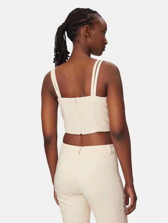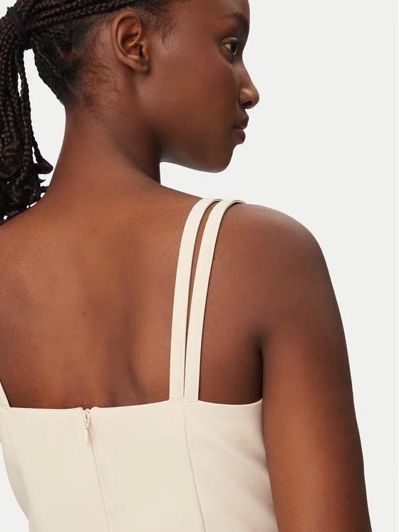 l design pulito e strutturato è valorizzato dallo scollo a V sagomato e dalle raffinate doppie spalline sottili, dettagli che incorniciano con grazia il décolleté. La vestibilità aderente segue le forme del corpo, esaltata da tagli verticali che ne definiscono la linea. La pratica chiusura posteriore con zip invisibile mantiene intatta l'estetica minimale del modello, garantendo al contempo un indosso confortevole.