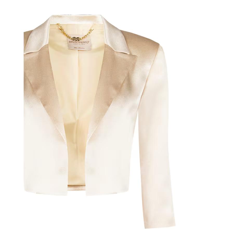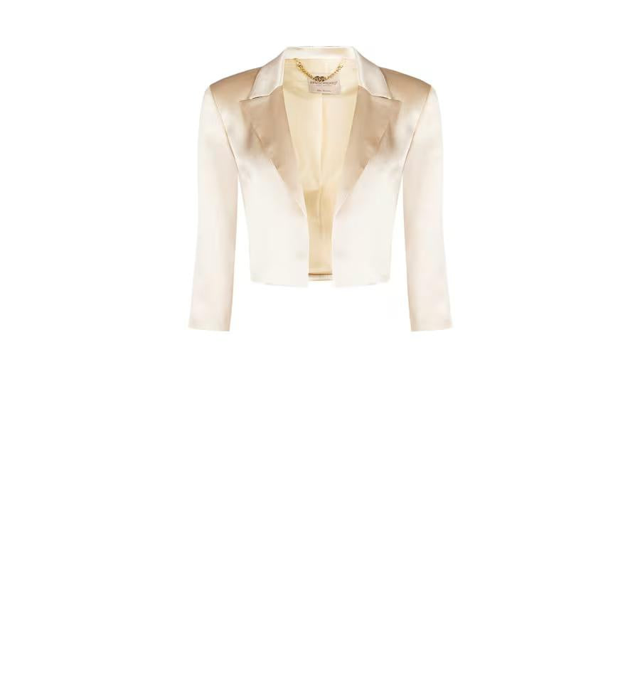 Blazer corto dalla linea asciutta in tessuto satinato, morbido al tatto e leggermente strutturato. Rever affilato e dettaglio catena interna illuminano il décolleté. Perfetto su abiti e pantaloni a vita alta per cerimonie, party e ufficio elegante.