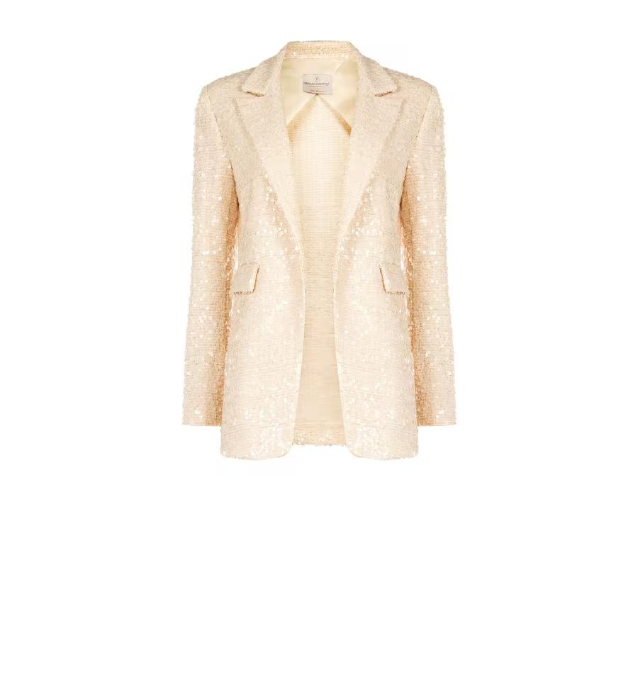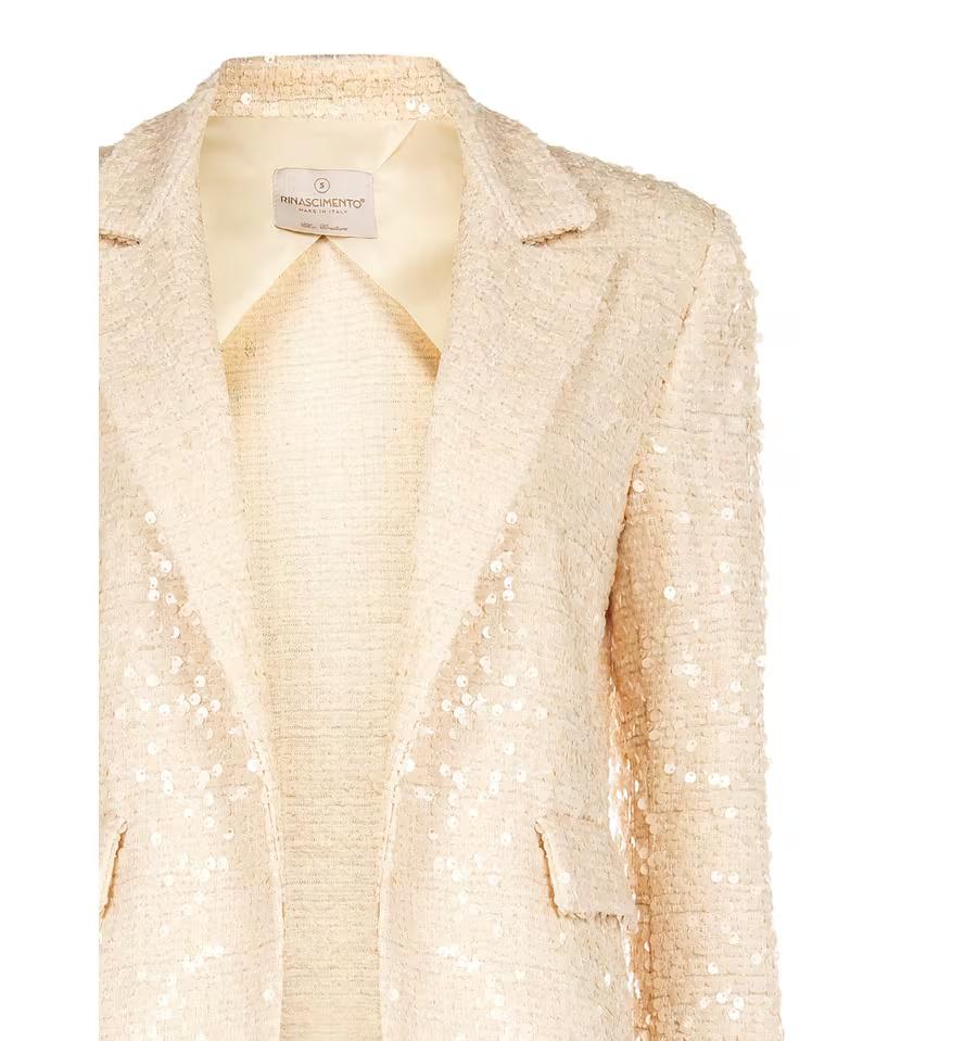 Blazer Rinascimento dalla silhouette dritta e leggermente morbida in tessuto bouclé impreziosito da paillettes all-over. Revers a punta e tasche con patta definiscono la silhouette. Perfetto sopra il denim o abiti fluidi, per dare un tocco sofisticato all'ufficio, ai cocktail party e alle occasioni speciali.