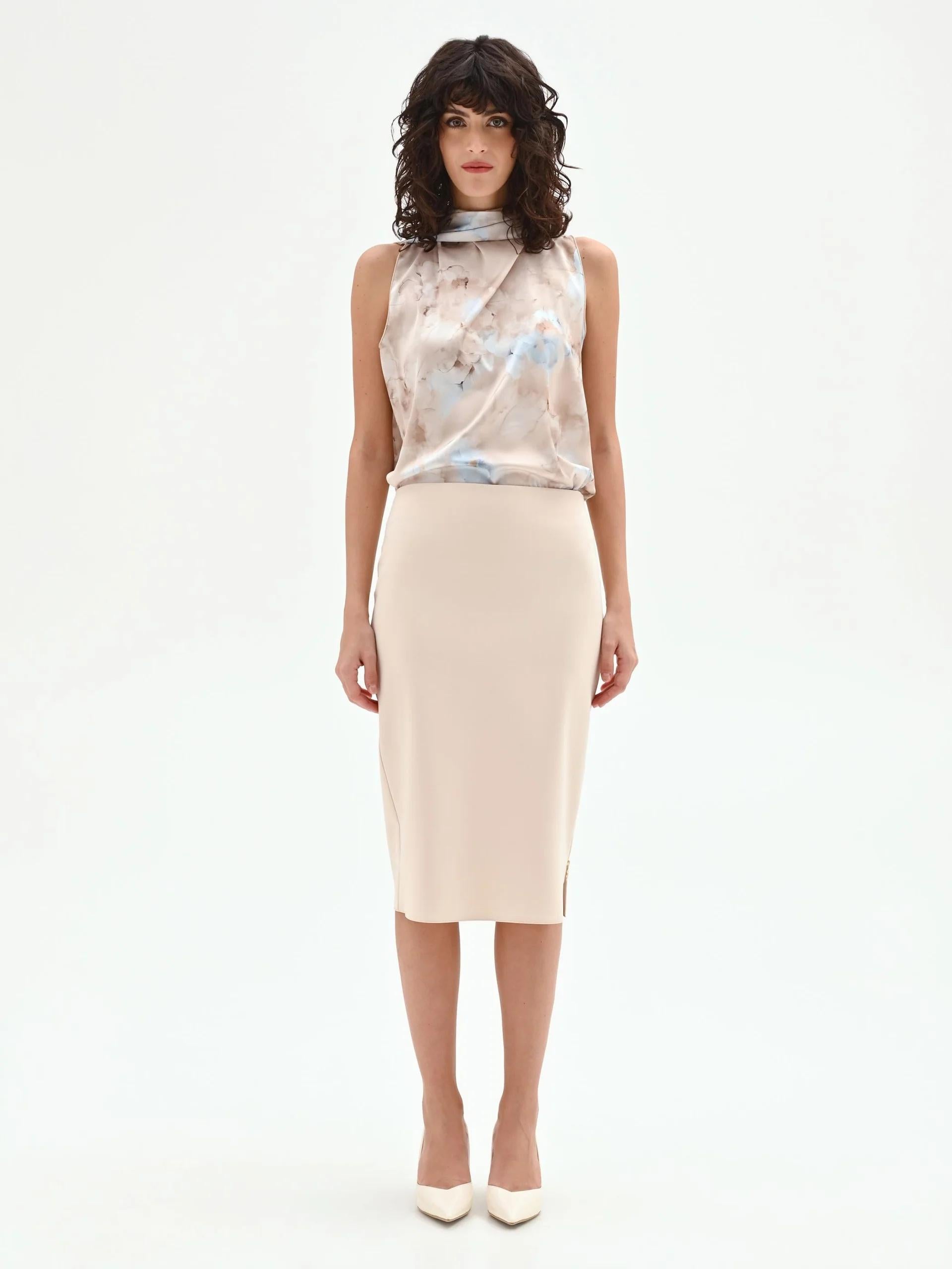 Il modello presenta una vita alta e pulita che slancia la figura, scendendo con una linea aderente fino alla lunghezza midi, un perfetto equilibrio tra formalità e tendenza. A interrompere il design minimalista è un piccolo spacco laterale, un dettaglio discreto ma di carattere, impreziosito da un inserto metallico dorato che aggiunge un punto luce. La chiusura con zip posteriore scompare nella cucitura, mantenendo l'estetica pulita del capo.
