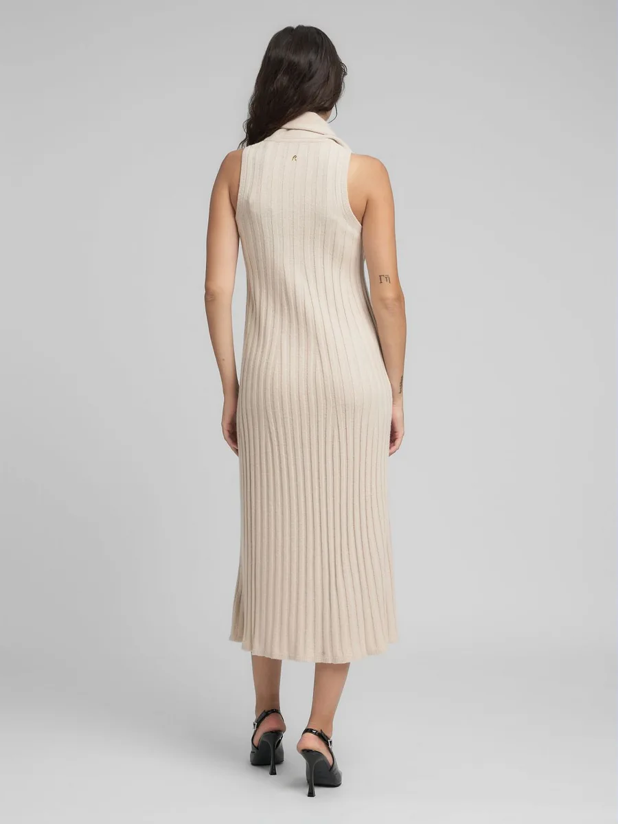 Abito smanicato con lunghezza midi e vestibilità regolare realizzato in misto lana con lavorazione a coste piatte. A completare il vestito troviamo un particolare collo che prosegue sotto forma di sciarpa in tono e l'iconico dettaglio R sul retro, espressione delDNA Replay.